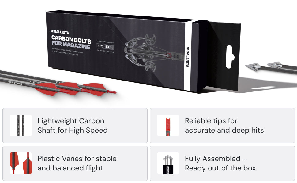 Upgrade your shooting experience with the Carbon Bolts for Ballista Bat and BAT Reverse Pistol Crossbow with Magazine. These 10.5" pure carbon bolts are designed to elevate your precision in every shot. Exclusively compatible with the Ballista BAT and BAT Reverse Pistol Crossbow with Magazine, this pack of 6 bolts ensures that you're always ready for action, whether it's practice or competition. Experience the difference and reliability of the Carbon Bolts in your shooting endeavors.