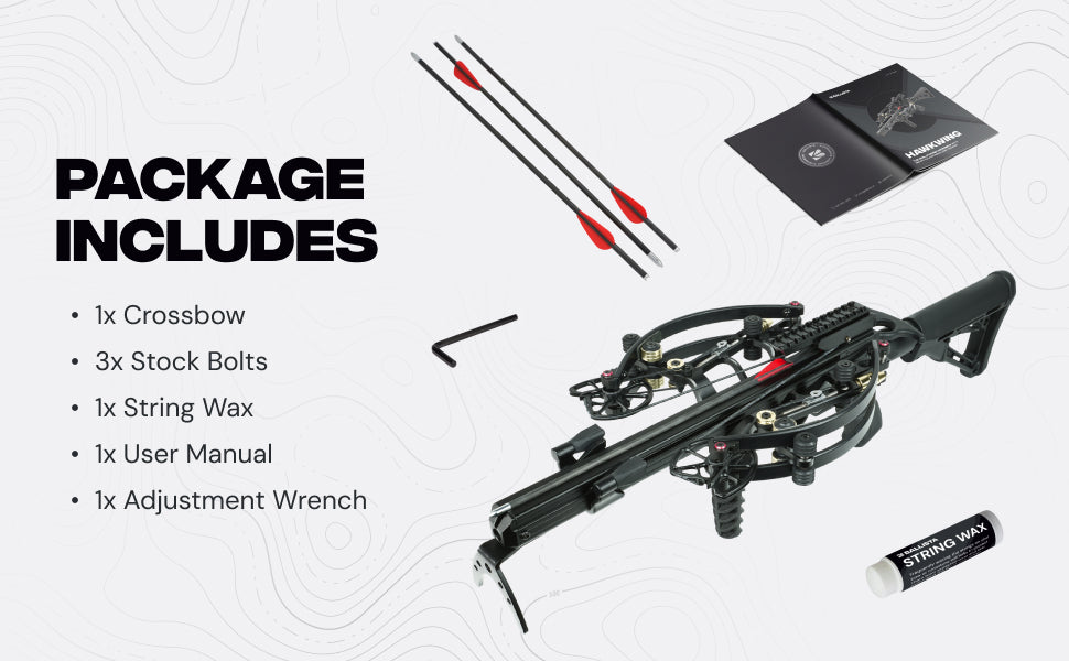 You’re set from day one: Hawkwing crossbow, 3× stock bolts, string wax, draw weight adjustment wrench and a user manual. Add your preferred optic on the Picatinny rail and head straight to the range or into the woods.