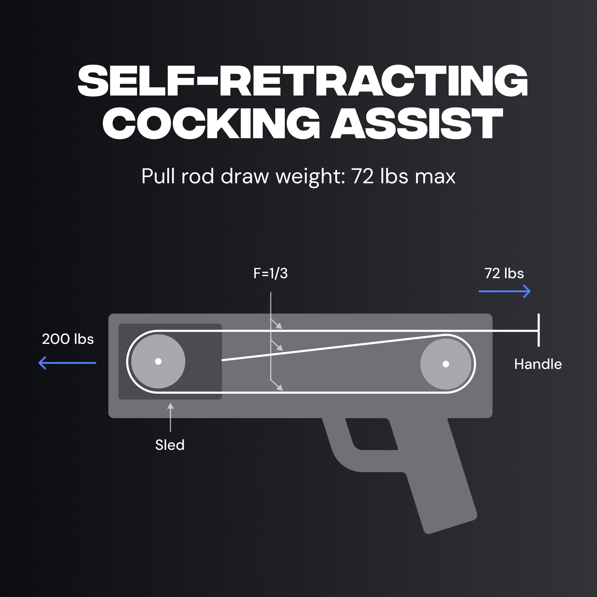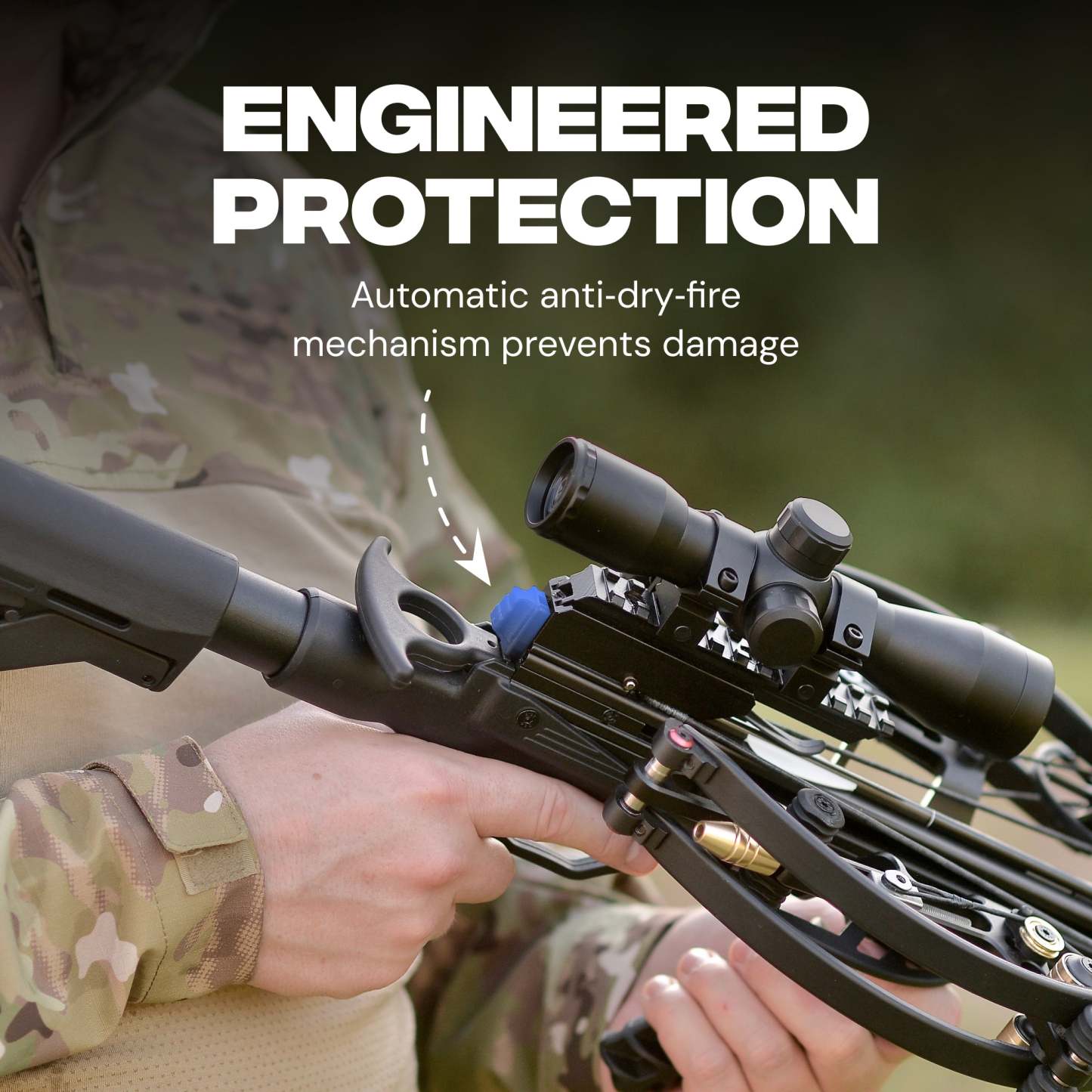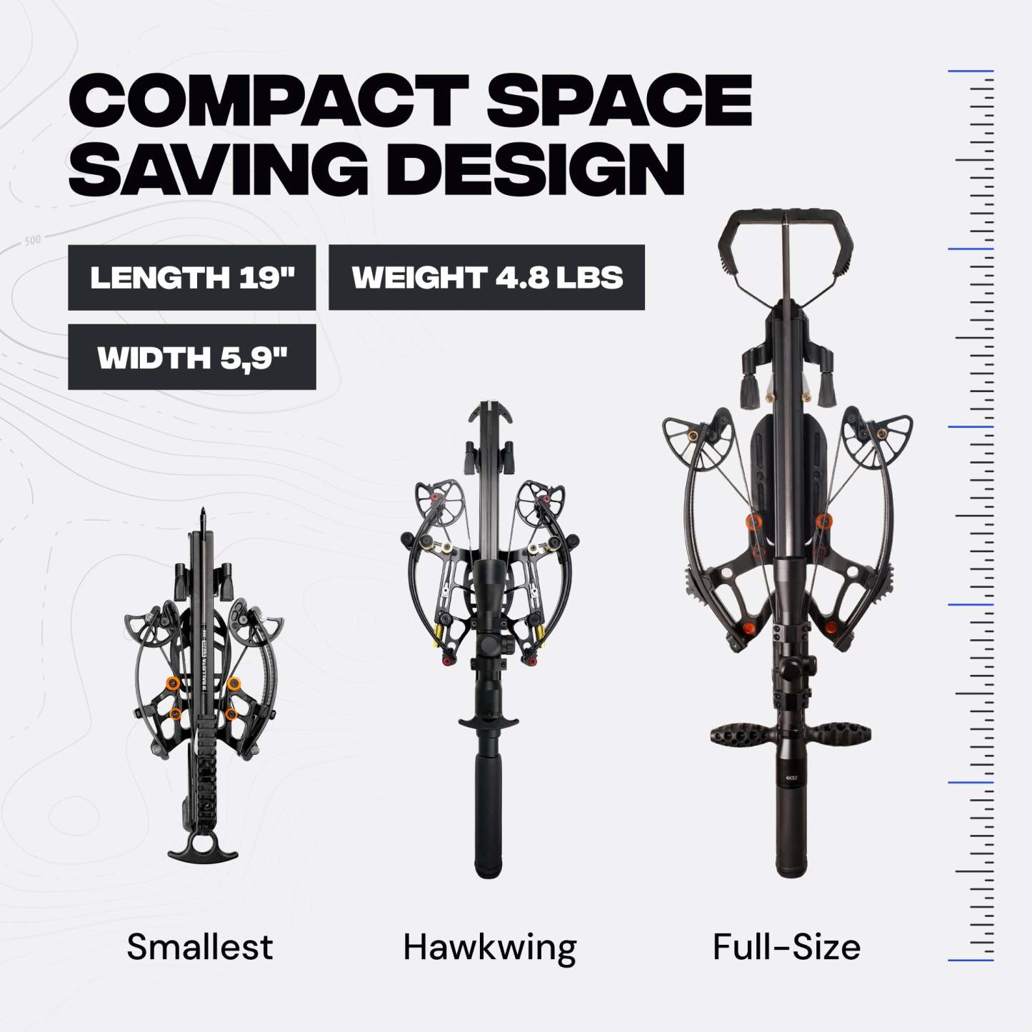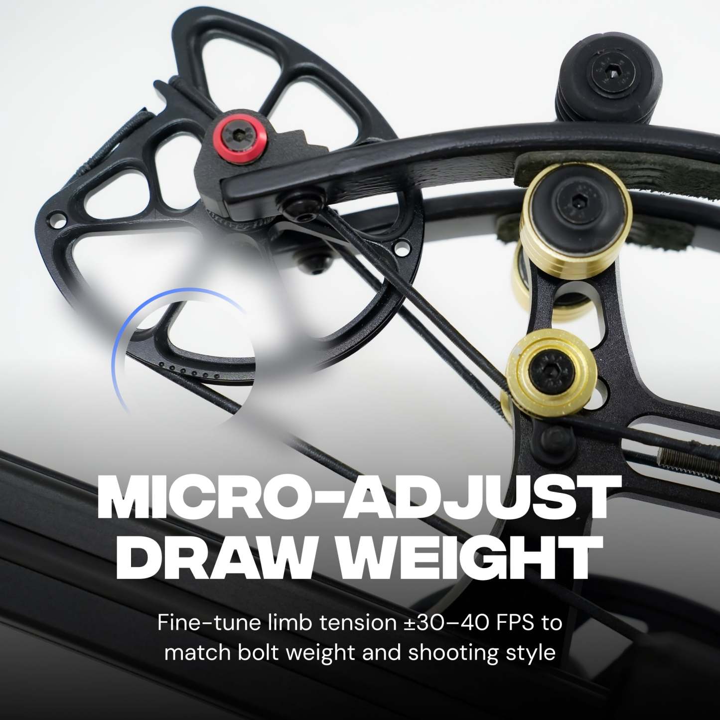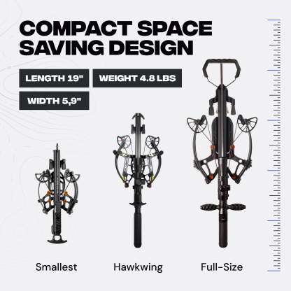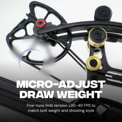 Don’t let the compact footprint fool you. Hawkwing reaches up to 500 FPS with our light 150gr 14″ stock bolts. With heavier hunting arrows the speed is different: about 425 FPS with 250gr 16″ bolts (AL insert) and about 340 FPS with 363gr 16″ bolts (SS insert). It also features an automatic anti‑dry‑fire for safety. Cocked width is just 5.9 in A2A and overall length with stock is under 19 in — ideal for blinds, tree stands, and tight cover. With micro‑adjustable limb poundage you can fine‑tune draw weight and adjust arrow speed by ±30–40 FPS to match your setup.