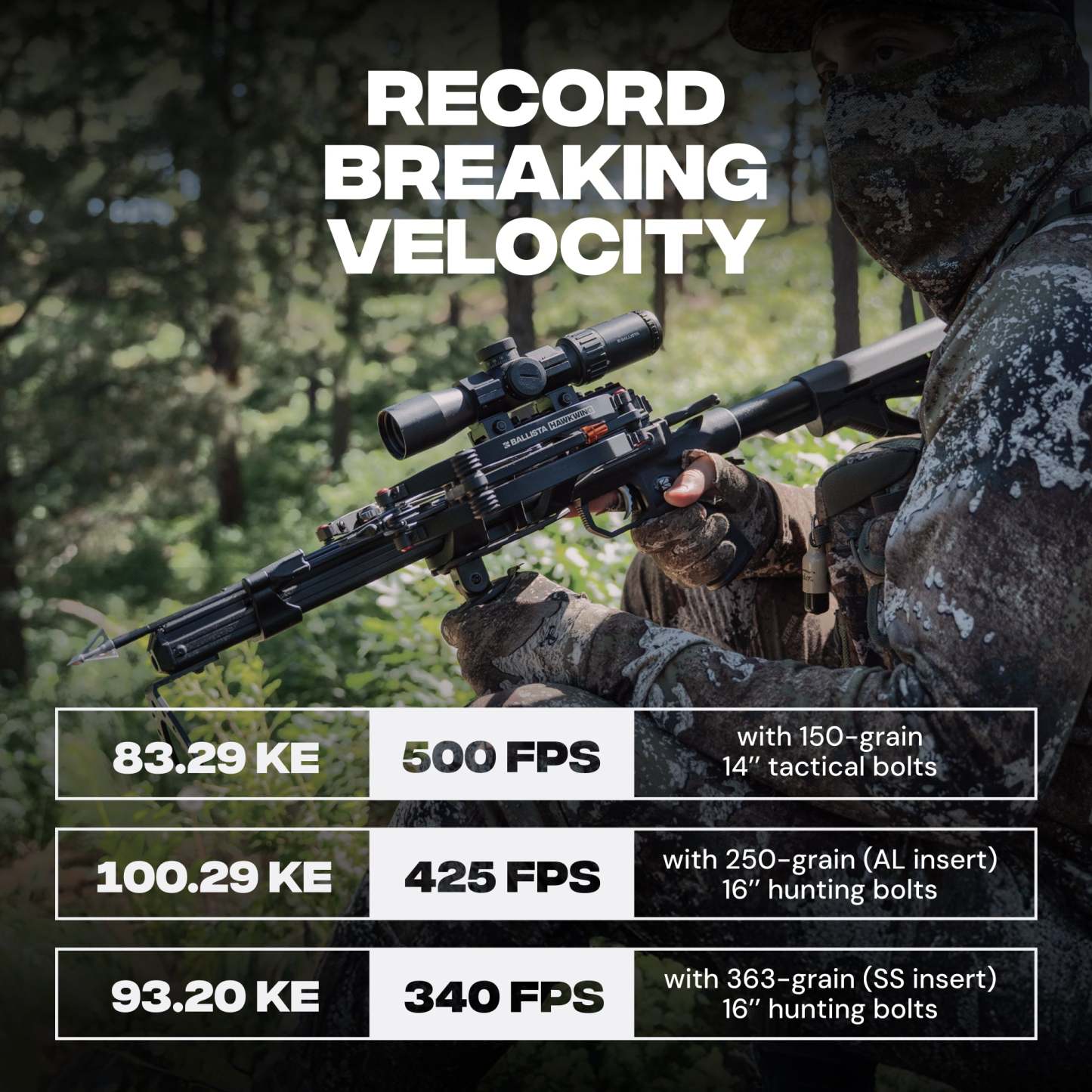 - 363gr 16″ Ballista Bolt (SS insert): ~340 FPS, ~93.20 KE