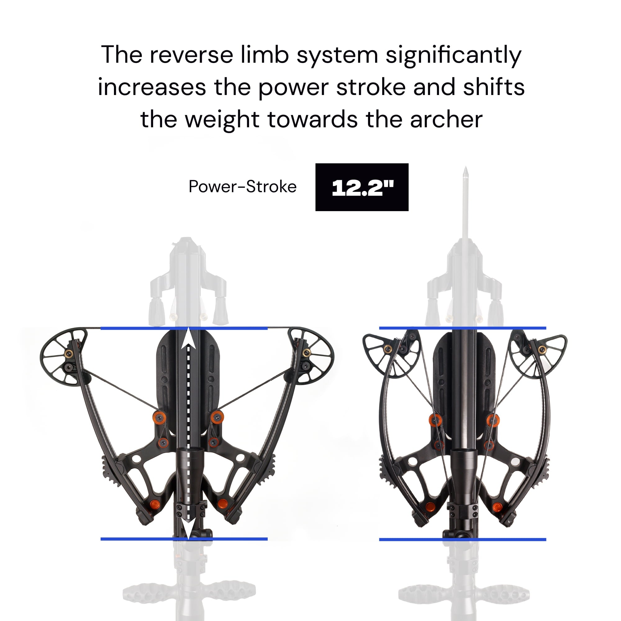 Its unique reverse-draw limb design increases the power stroke to 12.2 inches, enhancing the force on each shot. The reverse limb setup also improves balance and minimizes forward movement, giving you superior stability and retention during use.