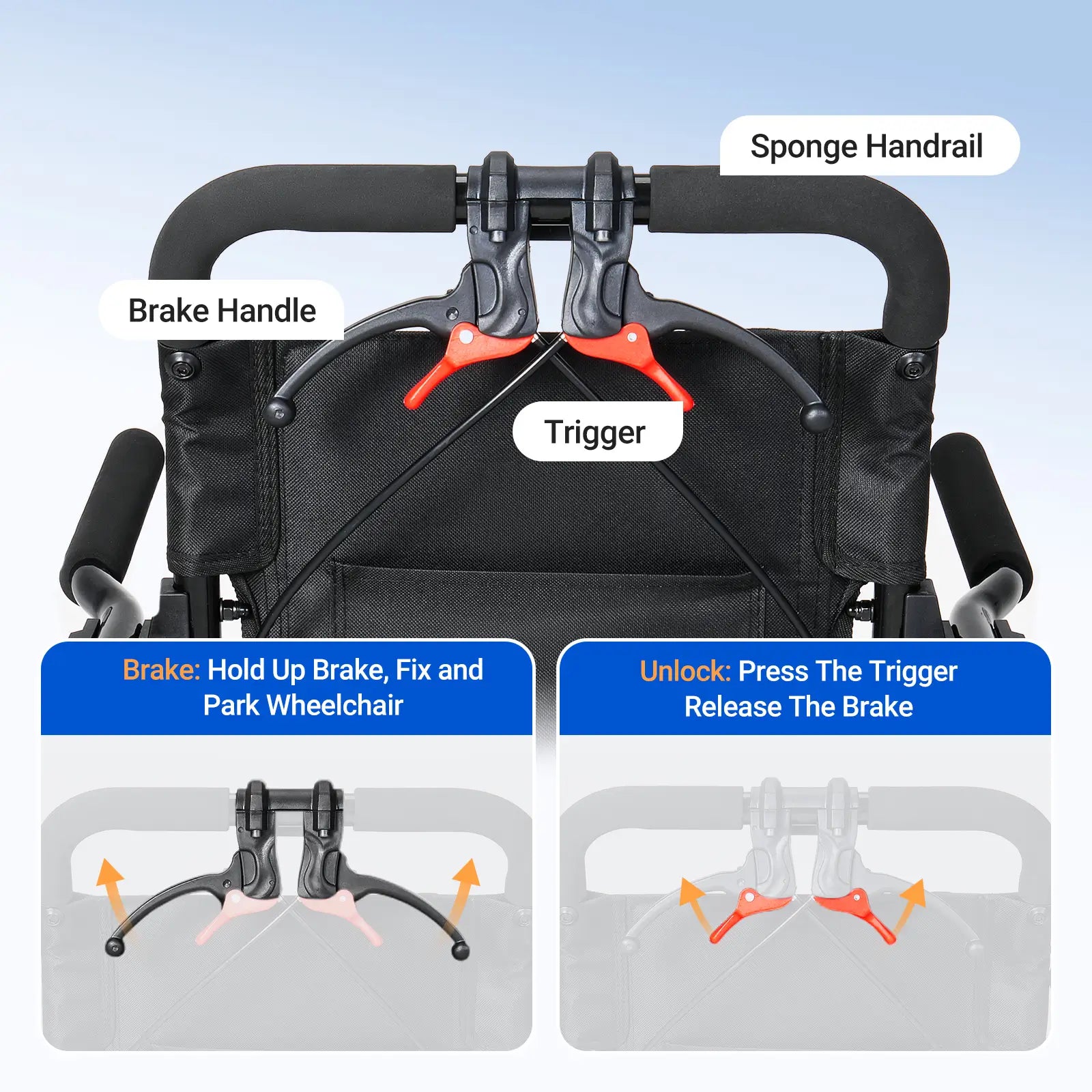 Ultra-Light Aluminum Alloy Frame, Only 22.4 lbs, Foldable, Ergonomic support, 13-inch retractable armrests. Made for daily, travel, and outdoor use. Multi terrain available, Travel-friendly, Airline Approved.