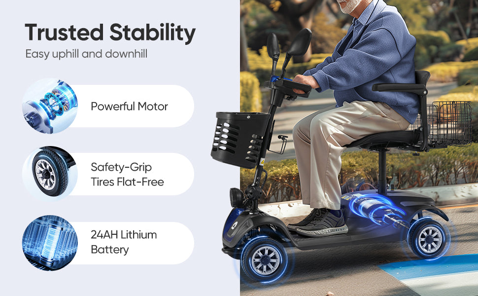 Experience effortless mobility with our powerful 250W motor, designed to easily conquer inclines. Our mobility scooter prioritizes your safety with intelligent speed control to prevent excessive speed on steep slopes. The rear anti-tip wheels ensure stability, and the battery comes with overload protection. Glide smoothly over any terrain with 8-inch flat-free solid rubber tires, offering comfort and stability for the elderly.